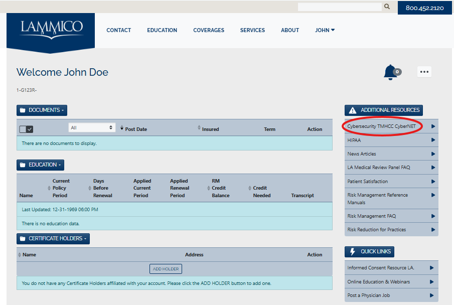 LAMMICO provides policyholders TMHCC CyberNET®: an advanced cyber risk management resource and education center. Log in as a Member to access the TMHCC CyberNET® portal. Once logged in, click "Cybersecurity TMHCC CyberNET" under the Additional Resources section of your Member dashboard, as shown in the image below.